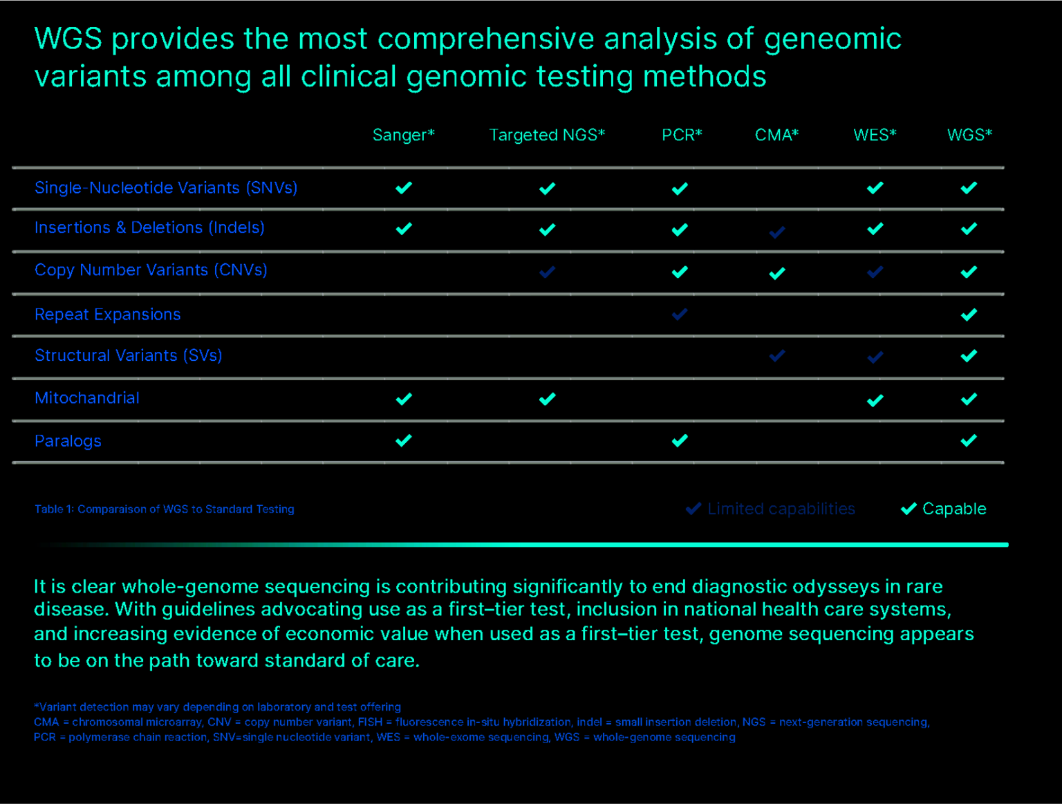 WGS captures one of the most extensive ranges of genetic variants in a single test, enabling superior diagnostic yield across diverse conditions. Especially for patients with inconclusive results from prior testing, WGS can solve up to 30% of cases that other methods miss—saving valuable time to diagnosis and guiding more precise treatment decisions.